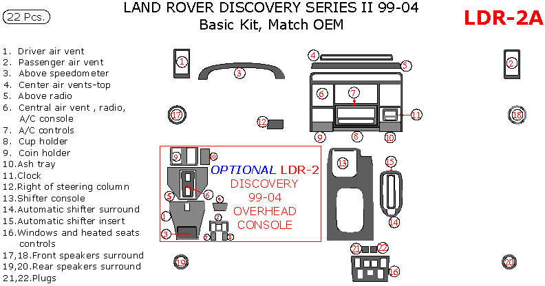 We offer a wide variety of colors and materials of Land Rover Discovery 1999, 2000, 2001, 2002, 2003, 2004, Basic Interior Kit, 22 Pcs, Match OEM. Choose your favourite option and place an order.