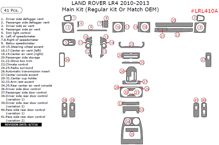 Land Rover LR4 2010, 2011, 2012, 2013, Main Interior Kit (Regular Kit Or Match OEM), 41 Pcs.