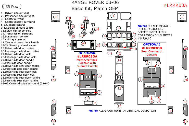 We offer a wide variety of colors and materials of Land Rover Range Rover 2003, 2004, 2005, 2006, Basic Interior Kit, 39 Pcs. Choose your favourite option and place an order.