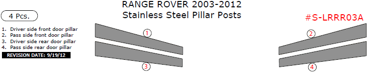 We offer a wide variety of colors and materials of Range Rover 2003, 2004, 2005, 2006, 2007, 2008, 2009, 2010, 2011, 2012, Stainless Steel Pillar Posts, 4 Pcs. Choose your favourite option and place an order.