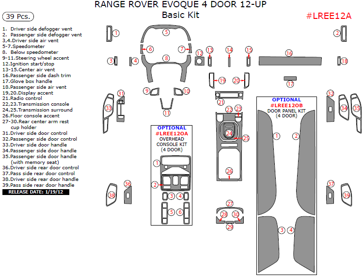We offer a wide variety of colors and materials of Land Rover Range Rover Evoque 2012, 2013, 2014, 2015, 2016, 2017, Basic Interior Kit (4 Door), 39 Pcs. Choose your favourite option and place an order.