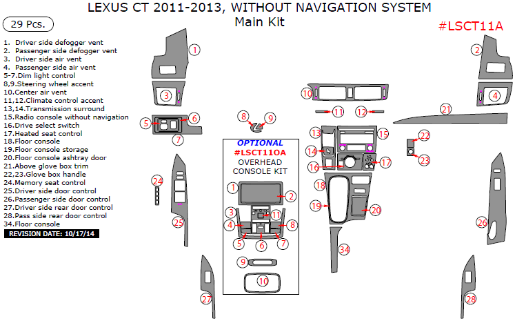 Lexus CT 2011, 2012, 2013, Without Navigation System, Main Interior Kit, 29 Pcs.