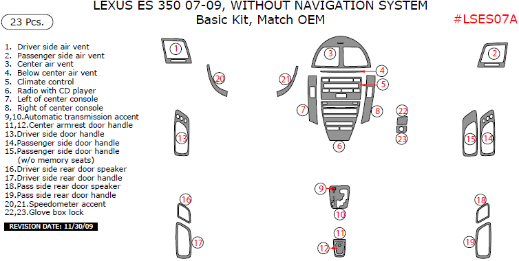 Lexus ES 2007, 2008, 2009, Without Navigation System, Basic Interior Kit, 23 Pcs.