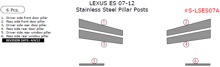We offer a wide variety of colors and materials of Lexus ES 2007, 2008, 2009, 2010, 2011, 2012, Stainless Steel Pillar Posts, 6 Pcs. Choose your favourite option and place an order.