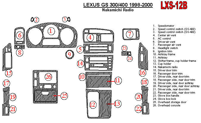 We offer a wide variety of colors and materials of Lexus GS 1998, 1999, 2000, Interior Dash Kit, Nakamichi Radio, Match OEM, Natural Wood, 26 Pcs. Choose your favourite option and place an order.