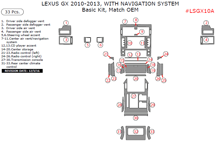 Lexus GX 2010, 2011, 2012, 2013, With Navigation System, Basic Interior Kit, 33 Pcs., Match OEM