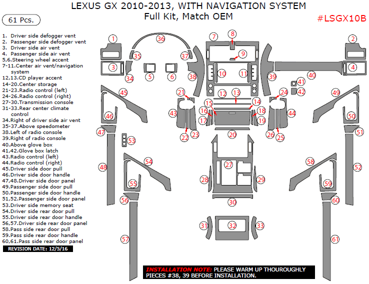 Lexus GX 2010, 2011, 2012, 2013, With Navigation System, Full Interior Kit, 61 Pcs., Match OEM