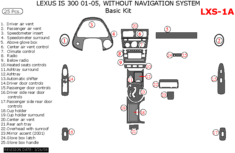 Lexus IS 2001, 2002, 2003, 2004, 2005, Basic Interior Kit, Without Navigation, 25 Pcs.