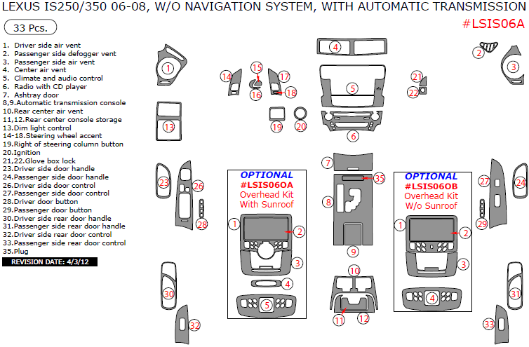 We offer a wide variety of colors and materials of Lexus IS 2006, 2007, 2008, Interior Dash Kit, Without OEM Wood, With Automatic Transmission, W/o Navigation System, 33 Pcs. Choose your favourite option and place an order.
