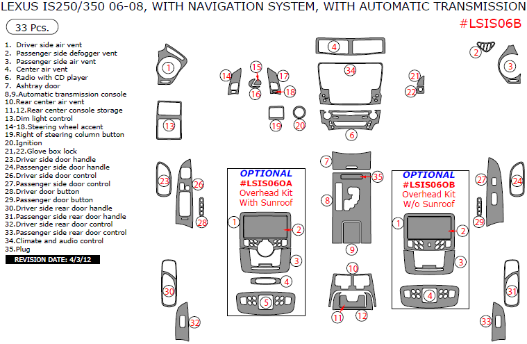 We offer a wide variety of colors and materials of Lexus IS 2006, 2007, 2008, Interior Dash Kit, Without OEM Wood, With Automatic Transmission, With Navigation System, 33 Pcs. Choose your favourite option and place an order.