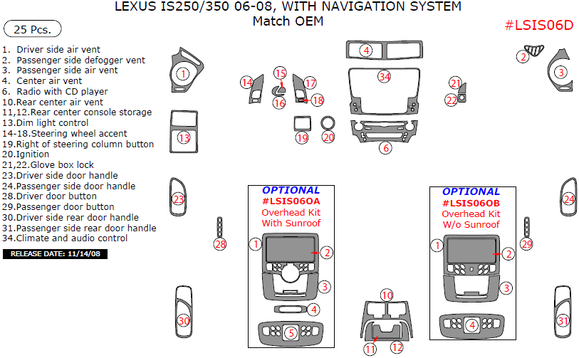 We offer a wide variety of colors and materials of Lexus IS 2006, 2007, 2008, Interior Dash Kit, With Navigation System, 25 Pcs., Match OEM. Choose your favourite option and place an order.