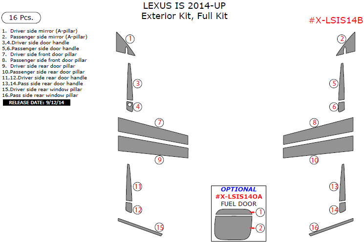 Lexus IS 2014, 2015, 2016, 2017, Exterior Kit, Full Interior Kit, 16 Pcs.