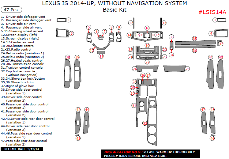 Lexus IS 2014, 2015, 2016, 2017, Without Navigation System, Basic Interior Kit, 47 Pcs.