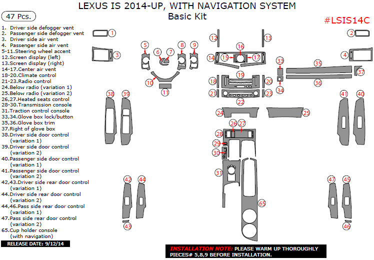 Lexus IS 2014, 2015, 2016, 2017, With Navigation System, Basic Interior Kit, 47 Pcs.