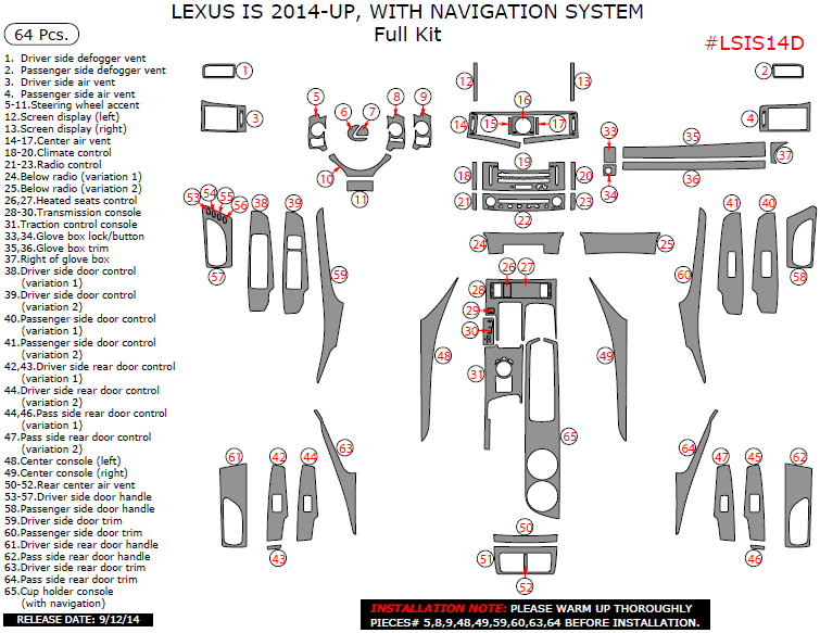 Lexus IS 2014, 2015, 2016, 2017, With Navigation System, Full Interior Kit, 64 Pcs.