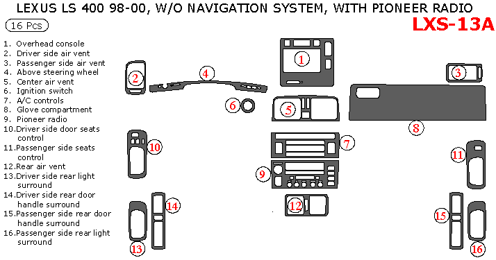 We offer a wide variety of colors and materials of Lexus LS 1998, 1999, 2000, Interior Dash Kit, Pioneer Radio, 16 Pcs., Match OEM. Choose your favourite option and place an order.