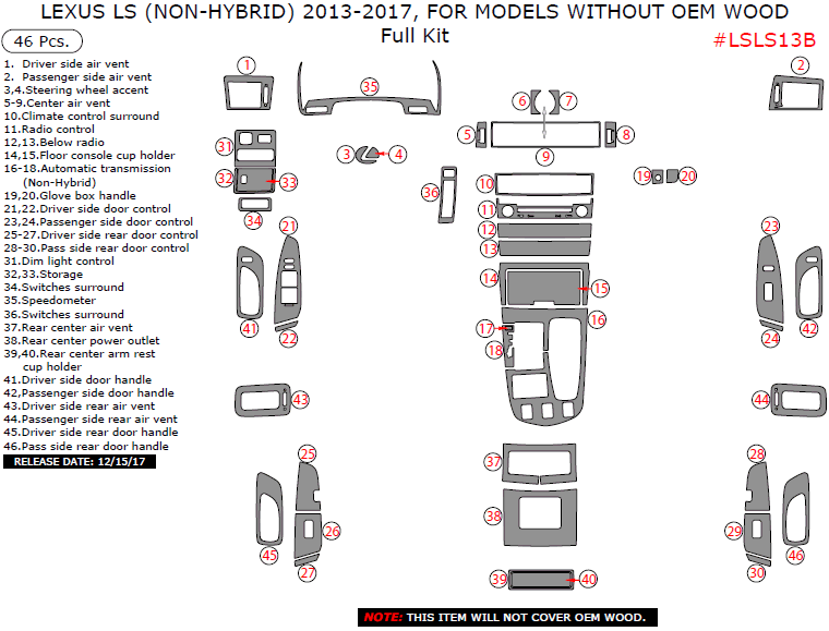 Lexus LS (Non-Hybrid) 2013-2017, For Models Without OEM Wood, Full Kit, 46 Pcs. Please Select Color RBA - Real Brushed Aluminum / add 15% RBBCF - Real Blue & Black Carbon Fiber / add 30% RC - Real Chrome RCF - Real Carbon Fiber / add 30% RDBCF - Real Dark Blue Carbon Fiber / add 30% RDMW - Real Dark Mahogany Wood (Non Stock Color) / add 30% RJCW - Real Japanese Cherry Wood / add 30% RMBW - Real Medium Burl Wood (Non Stock Color) / add 30% ROCF - Real Orange Carbon Fiber / add 30% RPW - Real Platinum Wood / add 30% RRBCF - Real Red & Black Carbon Fiber / add 30% RRCF - Real Red Carbon Fiber / add 30% RRW - Real Rosewood / add 30% RSWCF - Real Silver Wire Carbon Fiber / add 30% RWBW - Real Walnut Burl Wood (Non Stock Color) / add 30% RYBCF - Real Yellow & Black Carbon Fiber / add 30% RYCF - Real Yellow Carbon Fiber / add 30% SA - Aluminum (Non Stock Color) SAZW - African Zebra Wood SBA - Brushed Aluminum SBEW - Birdseye Wood (Non Stock Color) SBLACK - Black (Non Stock Color) SBLUE - Blue (Non Stock Color) SCF - Carbon Fiber SDBW - Dark Burl Wood SDESERT - Desert Camo (Non Stock Color) SDMW - Dark Mahogany Wood (Non Stock Color) SDZW - Dark Zebra Wood (Non Stock Color) SEZW - Ebony Zebra Wood (Non Stock Color) SFOREST - Forest Camo (Non Stock Color) SHBW - Honey Burl Wood SJCW - Japanese Cherry Wood (Non Stock Color) SMBW - Medium Burl Wood SNBW - Newport Burl Wood SORANGE - Orange (Non Stock Color) SPINK - Pink (Non Stock Color) SPW - Platinum Burl Wood SRED - Red (Non Stock Color) STBW - Titanium Burl Wood SWBW - Walnut Burl Wood (Non Stock Color) SWHITE - White (Non Stock Color) SYELLOW - Yellow (Non Stock Color) Item #:LSLS13B Random Image. Example only. See diagram $293.02 - $380.93 Price as configured: $293.02 MANUFACTURING TIME 5-7 BUSINESS DAYS FREE SHIPPING TO CONTINENTAL USA Add to Cart Add to Wishlist Price as configured: $336.97 Item #: LSLS13B Add to Cart Random Image. Example only. See diagram RBA - Real Brushed Aluminum RBBCF - Real Blue & Black Carbon Fiber RC - Real Chrome RCF - Real Carbon Fiber RDBCF - Real Dark Blue Carbon Fiber RDMW - Real Dark Mahogany Wood (Non Stock Color) RJCW - Real Japanese Cherry Wood RMBW - Real Medium Burl Wood (Non Stock Color) ROCF - Real Orange Carbon Fiber RPW - Real Platinum Wood RRBCF - Real Red & Black Carbon Fiber RRCF - Real Red Carbon Fiber RRW - Real Rosewood RSWCF - Real Silver Wire Carbon Fiber RWBW - Real Walnut Burl Wood (Non Stock Color) RYBCF - Real Yellow & Black Carbon Fiber RYCF - Real Yellow Carbon Fiber SA - Aluminum (Non Stock Color) SAZW - African Zebra Wood SBA - Brushed Aluminum SBEW - Birdseye Wood (Non Stock Color) SBLACK - Black (Non Stock Color) SBLUE - Blue (Non Stock Color) SCF - Carbon Fiber SDBW - Dark Burl Wood SDESERT - Desert Camo (Non Stock Color) SDMW - Dark Mahogany Wood (Non Stock Color) SDZW - Dark Zebra Wood (Non Stock Color) SEZW - Ebony Zebra Wood (Non Stock Color) SFOREST - Forest Camo (Non Stock Color) SHBW - Honey Burl Wood SJCW - Japanese Cherry Wood (Non Stock Color) SMBW - Medium Burl Wood SNBW - Newport Burl Wood SORANGE - Orange (Non Stock Color) SPINK - Pink (Non Stock Color) SPW - Platinum Burl Wood SRED - Red (Non Stock Color) STBW - Titanium Burl Wood SWBW - Walnut Burl Wood (Non Stock Color) SWHITE - White (Non Stock Color) SYELLOW - Yellow (Non Stock Color) Description Additional information Reviews (0) CUSTOMER REVIEWS 0 ITEM(S) Add Your Review Let us know your thoughts * Summary of Your Review* What's your nickname?* Submit Review Description Additional information Reviews (0) CUSTOMER REVIEWS 0 ITEM(S) Add Your Review Let us know your thoughts * Summary of Your Review* What's your nickname?* Submit Review California Residents Warning Cancer and Reproductive Harm. www.p65warnings.ca.gov Other products $22.40 X-LSCT11OA Lexus CT 2011, 2012, 2013, Exterior Kit, Optional Fuel Door, 1 Pcs. more $28.00 X-LSGX10OA Lexus GX 2010, 2011, 2012, 2013, 2014, 2015, Exterior Kit, Optional Fuel Door, 1 Pcs. more $28.00 X-LSIS06OA Lexus IS 2006, 2007, 2008, 2009, 2010, 2011, 2012, 2013, Exterior Kit, Optional Fuel Door, 2 Pcs. more $28.00 X-LSIS14OA Lexus IS 2014, 2015, 2016, 2017 Exterior Kit, Optional Fuel Door, 2 Pcs. more $28.00 X-LSNX15OA Lexus NX 2015, 2016, 2017, 2018, 2019, 2020, 2021, Exterior Kit, Optional Fuel Door, 1 Pcs. more $28.00 X-LSRC15OA Lexus RC 2015, 2016, 2017, Exterior Kit, Optional Fuel Door, 2 Pcs. more RECENTLY VIEWED PRODUCTS Cadillac CTS 2006-2007, Interior Kit, With Automatic Transmission, With Logo, 43 Pcs., Match OEM RBA - Real Brushed Aluminum RBBCF - Real Blue & Black Carbon Fiber RC - Real Chrome RCF - Real Carbon Fiber RDBCF - Real Dark Blue Carbon Fiber RDMW - Real Dark Mahogany Wood (Non Stock Color) RJCW - Real Japanese Cherry Wood RMBW - Real Medium Burl Wood (Non Stock Color) ROCF - Real Orange Carbon Fiber RPW - Real Platinum Wood RRBCF - Real Red & Black Carbon Fiber RRCF - Real Red Carbon Fiber RRW - Real Rosewood RSWCF - Real Silver Wire Carbon Fiber RWBW - Real Walnut Burl Wood (Non Stock Color) RYBCF - Real Yellow & Black Carbon Fiber RYCF - Real Yellow Carbon Fiber SA - Aluminum (Non Stock Color) SAZW - African Zebra Wood SBA - Brushed Aluminum SBEW - Birdseye Wood (Non Stock Color) SBLACK - Black (Non Stock Color) SBLUE - Blue (Non Stock Color) SCF - Carbon Fiber SDBW - Dark Burl Wood SDESERT - Desert Camo (Non Stock Color) SDMW - Dark Mahogany Wood (Non Stock Color) SDZW - Dark Zebra Wood (Non Stock Color) SEZW - Ebony Zebra Wood (Non Stock Color) SFOREST - Forest Camo (Non Stock Color) SHBW - Honey Burl Wood SJCW - Japanese Cherry Wood (Non Stock Color) SMBW - Medium Burl Wood SNBW - Newport Burl Wood SORANGE - Orange (Non Stock Color) SPINK - Pink (Non Stock Color) SPW - Platinum Burl Wood SRED - Red (Non Stock Color) STBW - Titanium Burl Wood SWBW - Walnut Burl Wood (Non Stock Color) SWHITE - White (Non Stock Color) SYELLOW - Yellow (Non Stock Color) Random Image. Example only. See diagram