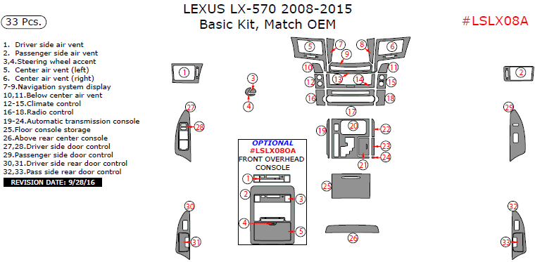 Lexus LX570 2008, 2009, 2010, 2011, 2012, 2013, 2014, 2015, Basic Interior Kit, 33 Pcs., Match OEM