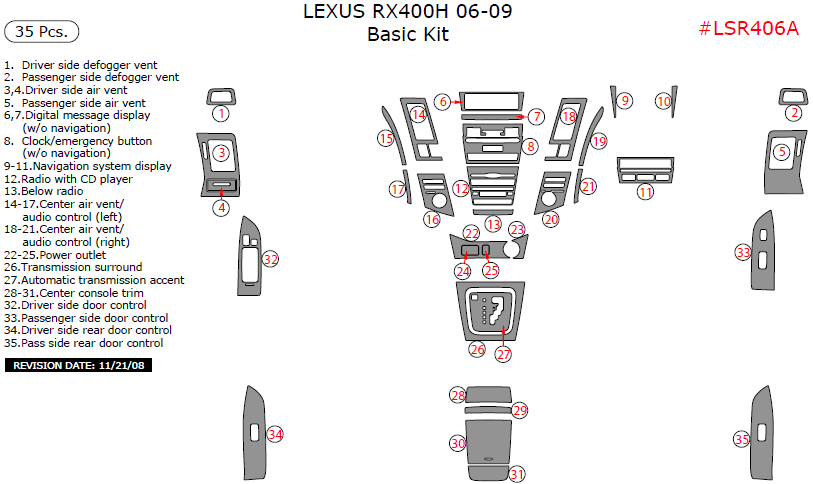 Lexus RX 2004, 2005, 2006, 2007, 2008, 2009, Basic Interior Kit (Hybrid Only), 35 Pcs.