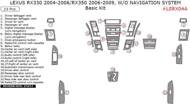 Lexus RX 2004, 2005, 2006, 2007, 2008, 2009, Basic Interior Kit, W/o Navigation System, 23 Pcs., Match OEM