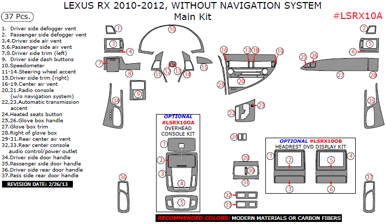 We offer a wide variety of colors and materials of Lexus RX 2010, 2011, 2012, Without Navigation System, Main Interior Kit, 37 Pcs. Choose your favourite option and place an order.