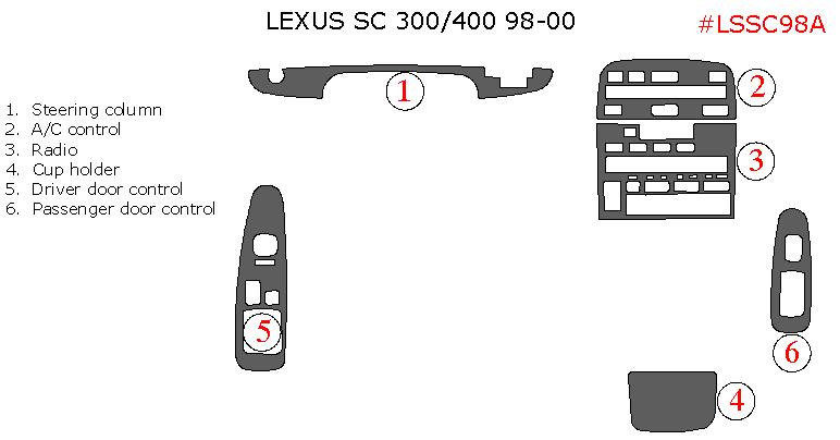 We offer a wide variety of colors and materials of Lexus SC 300/400 1998, 1999, 2000, Interior Dash Kit, 6 Pcs., Match OEM. Choose your favourite option and place an order.
