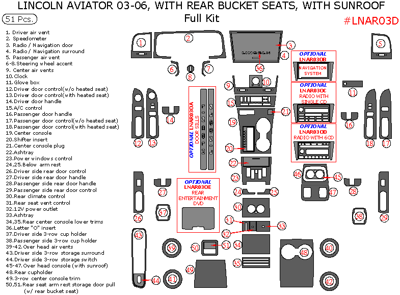 Lincoln Aviator 2003, 2004, 2005, 2006, With Rear Bucket Seats, With Sunroof, Full Interior Kit, 51 Pcs., Match OEM