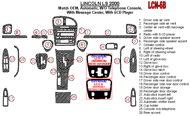 Lincoln LS 2000, Automatic, W/o Telephone Console Interior Kit, With Message Center, With 6 CD Player, 26 Pcs., Match OEM