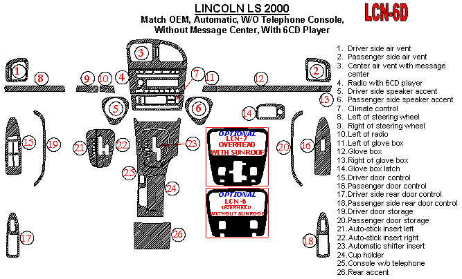 Lincoln LS 2000, Automatic, W/o Telephone Console Interior Kit, Without Message Center, With 6 CD Player, 26 Pcs., Match OEM