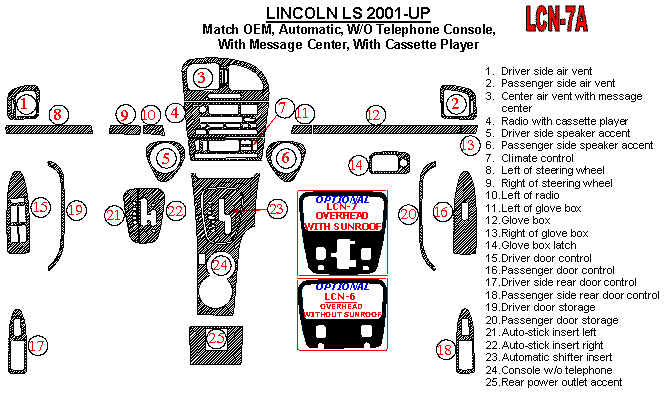 Lincoln LS 2001-2002, Automatic, W/o Telephone Console Interior Kit, With Message Center, With Cassette Player, 25 Pcs., Match OEM