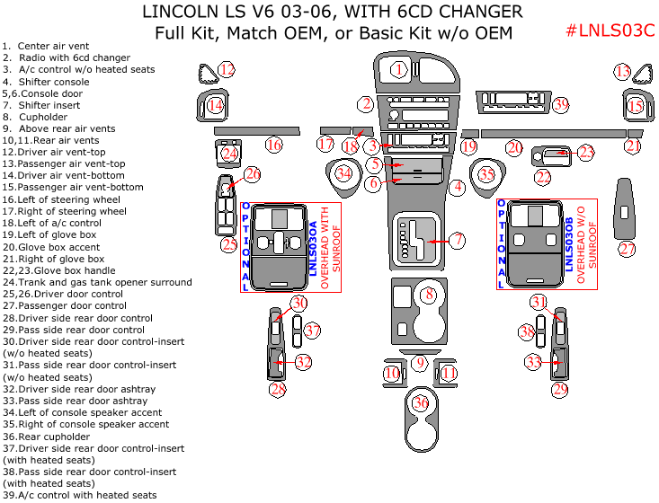 We offer a wide variety of colors and materials of Lincoln LS V6 2003, 2004, 2005, 2006, Full Interior Kit With Match OEM or Basic Kit Without OEM, 37 Pcs. Choose your favourite option and place an order.