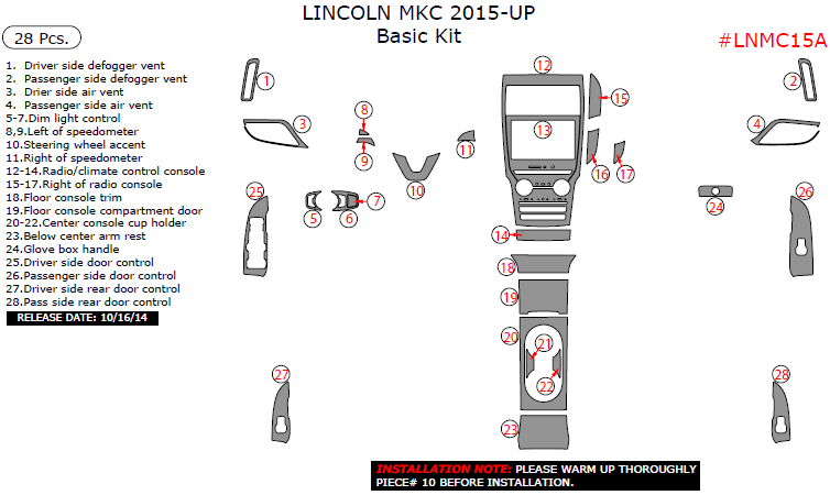 Lincoln MKC 2015, 2016, 2017, Basic Interior Kit, 28 Pcs.