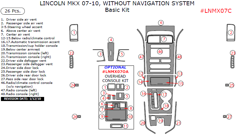 We offer a wide variety of colors and materials of Lincoln MKX 2007, 2008, 2009, 2010, Without Navigation System, Basic Interior Kit, 26 Pcs., Match OEM. Choose your favourite option and place an order.