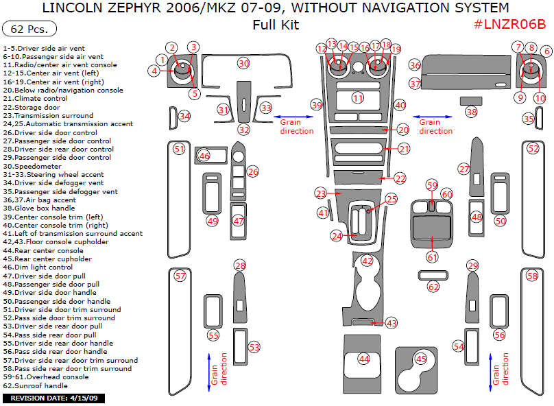 Lincoln MKZ (2007, 2008, 2009) / Zephyr (2006), Without Navigation System, Full Interior Kit, 62 Pcs.
