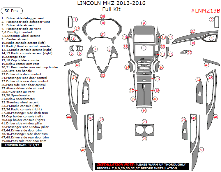 Lincoln MKZ 2013, 2014, 2015, 2016, Full Interior Kit, 50 Pcs.