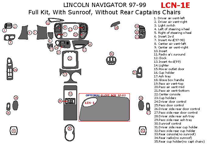 Lincoln Navigator 1997, 1998, 1999, Full Interior Kit, With Sunroof, Without Rear Captains Chairs, 35 Pcs., Match OEM