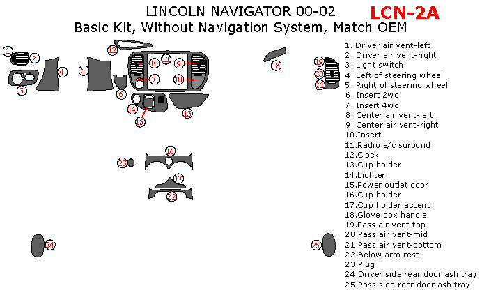 We offer a wide variety of colors and materials of Lincoln Navigator 2000, 2001, 2002, Basic Interior Kit, Without Navigation System, 25 Pcs., Match OEM. Choose your favourite option and place an order.