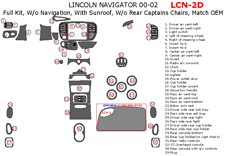 Lincoln Navigator 2000, 2001, 2002, Full Interior Kit, Without Navigation System, With Sunroof, Without Rear Captains Chairs 39 Pcs., Match OEM