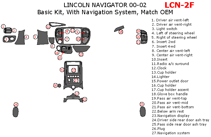 We offer a wide variety of colors and materials of Lincoln Navigator 2000, 2001, 2002, Basic Interior Kit, With Navigation System, 27 Pcs., Match OEM. Choose your favourite option and place an order.