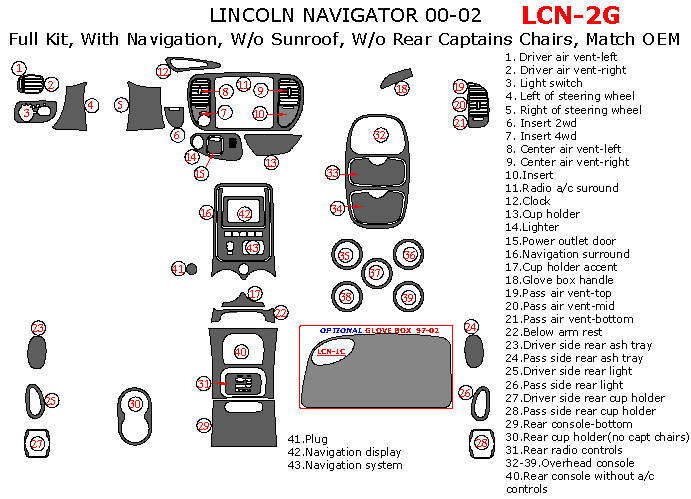 Lincoln Navigator 2000, 2001, 2002, Full Interior Kit, With Navigation System, Without Sunroof, Without Rear Captains Chairs 43 Pcs., Match OEM