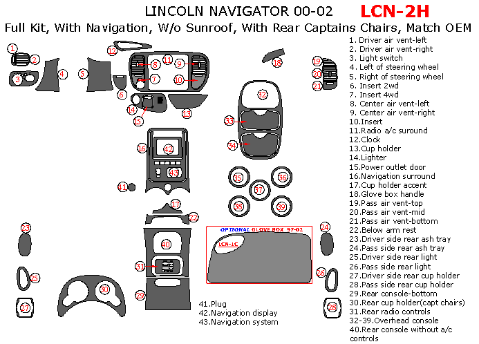 We offer a wide variety of colors and materials of Lincoln Navigator 2000, 2001, 2002, Full Interior Kit, With Navigation System, Without Sunroof, With Rear Captains Chairs 43 Pcs., Match OEM. Choose your favourite option and place an order.