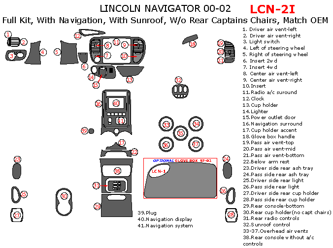 Lincoln Navigator 2000, 2001, 2002, Full Interior Kit, With Navigation System, With Sunroof, Without Rear Captains Chairs 41 Pcs., Match OEM