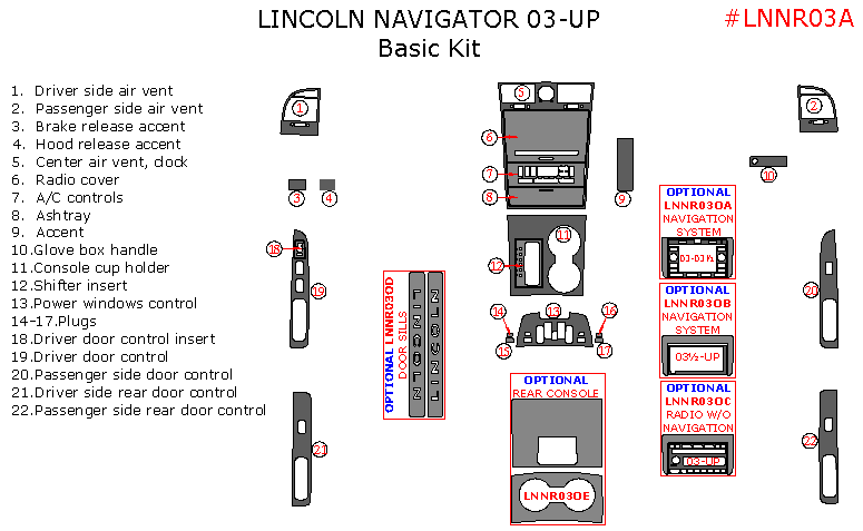 We offer a wide variety of colors and materials of Lincoln Navigator 2003-2004, Basic Interior Kit, 22 Pcs. Match OEM. Choose your favourite option and place an order.