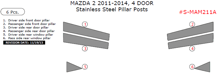 Mazda 2 2011, 2012, 2013, 2014, 4 Door, Stainless Steel Pillar Posts, 6 Pcs.