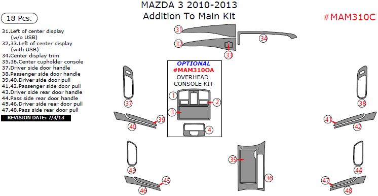 Mazda 3 2010, 2011, 2012, 2013, Addition To Main Interior Kit, 18 Pcs.