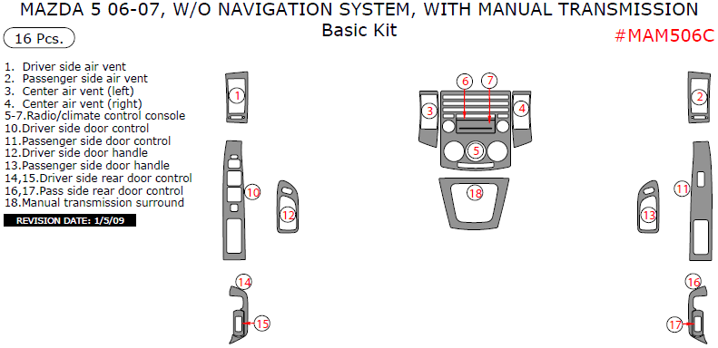Mazda 5 2006-2007, W/o Navigation System, With Manual Transmission, Basic Interior Kit, 16 Pcs.