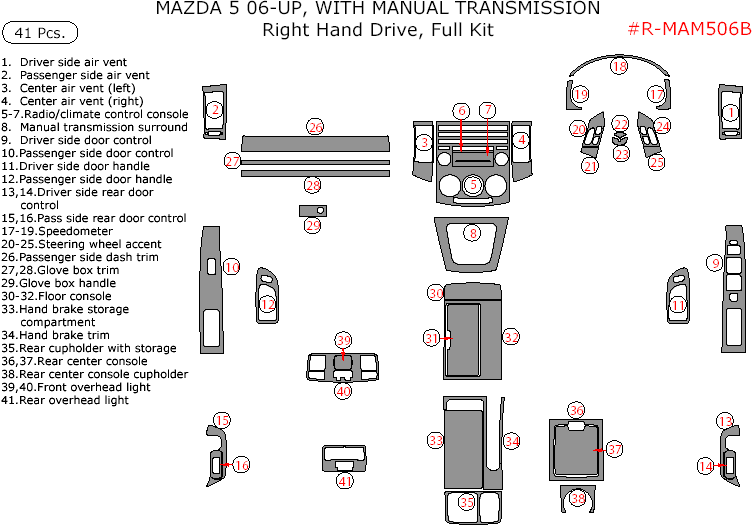Mazda 5 2006-2007, Right Hand Drive, With Manual Transmission, Full Interior Kit, 41 Pcs.