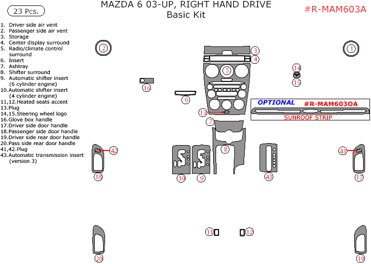 We offer a wide variety of colors and materials of Mazda 6 2003, 2004, 2005, Basic Interior Kit (Right Hand Drive), 23 Pcs. Choose your favourite option and place an order.