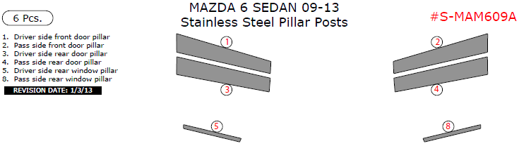 Mazda 6 Sedan 2009, 2010, 2011, 2012, 2013, Stainless Steel Pillar Posts, 6 Pcs.