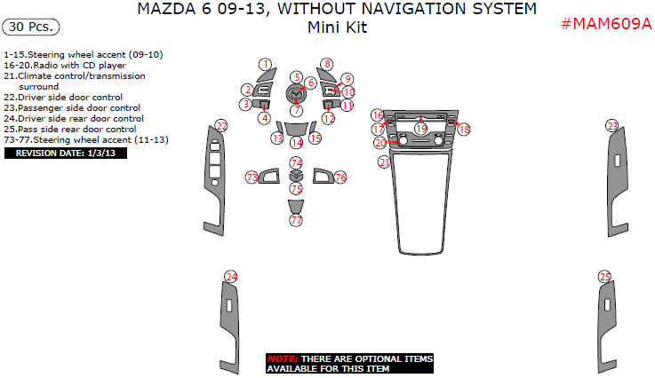 We offer a wide variety of colors and materials of Mazda 6 2009, 2010, 2011, 2012, 2013, Without Navigation System, Mini Interior Kit, 30 Pcs. Choose your favourite option and place an order.